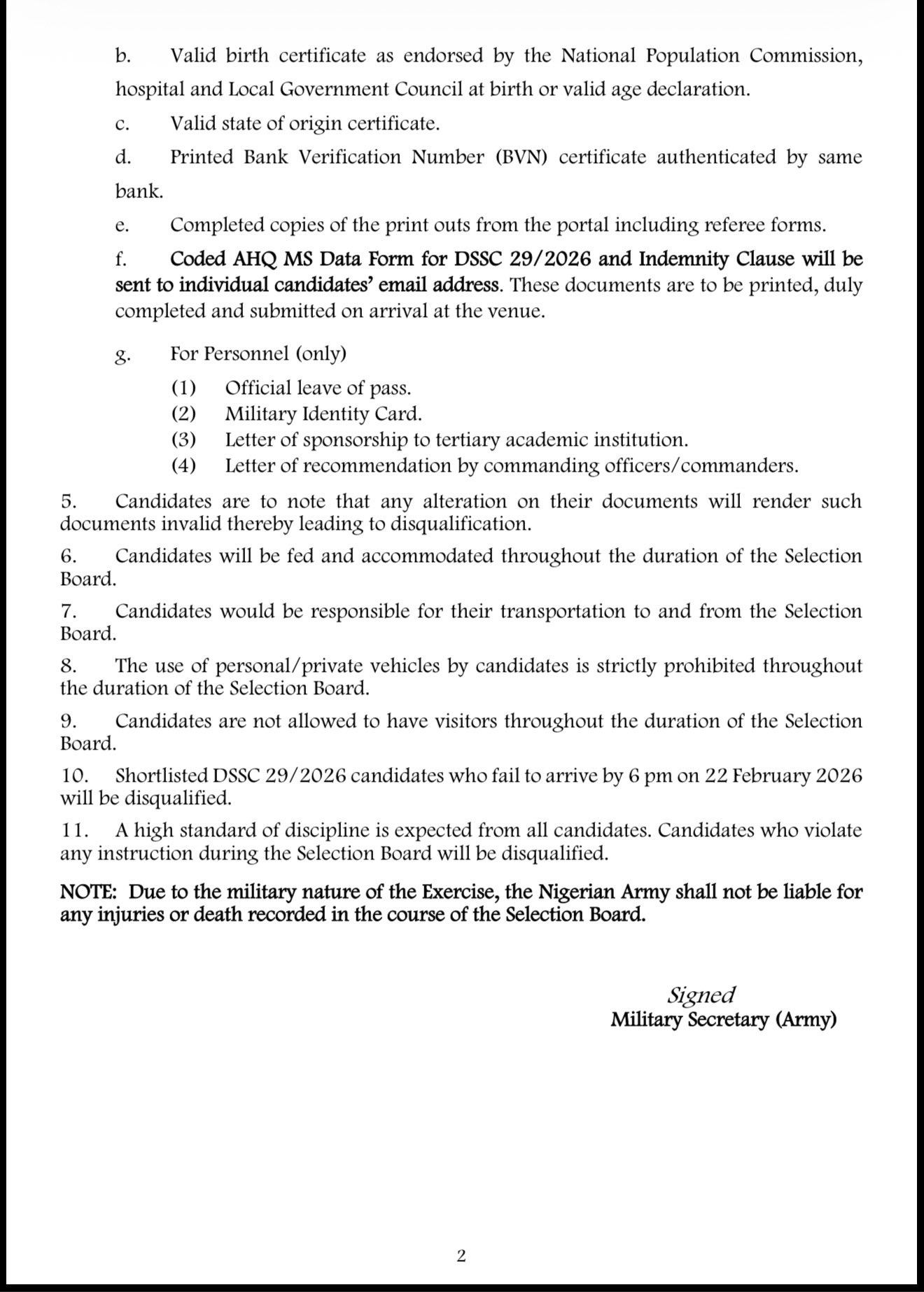 The shortlisted candidates are to report to the Nigerian Army School of Infantry (NASI), Jaji, Kaduna State from 9:am on 22 February, 2026.